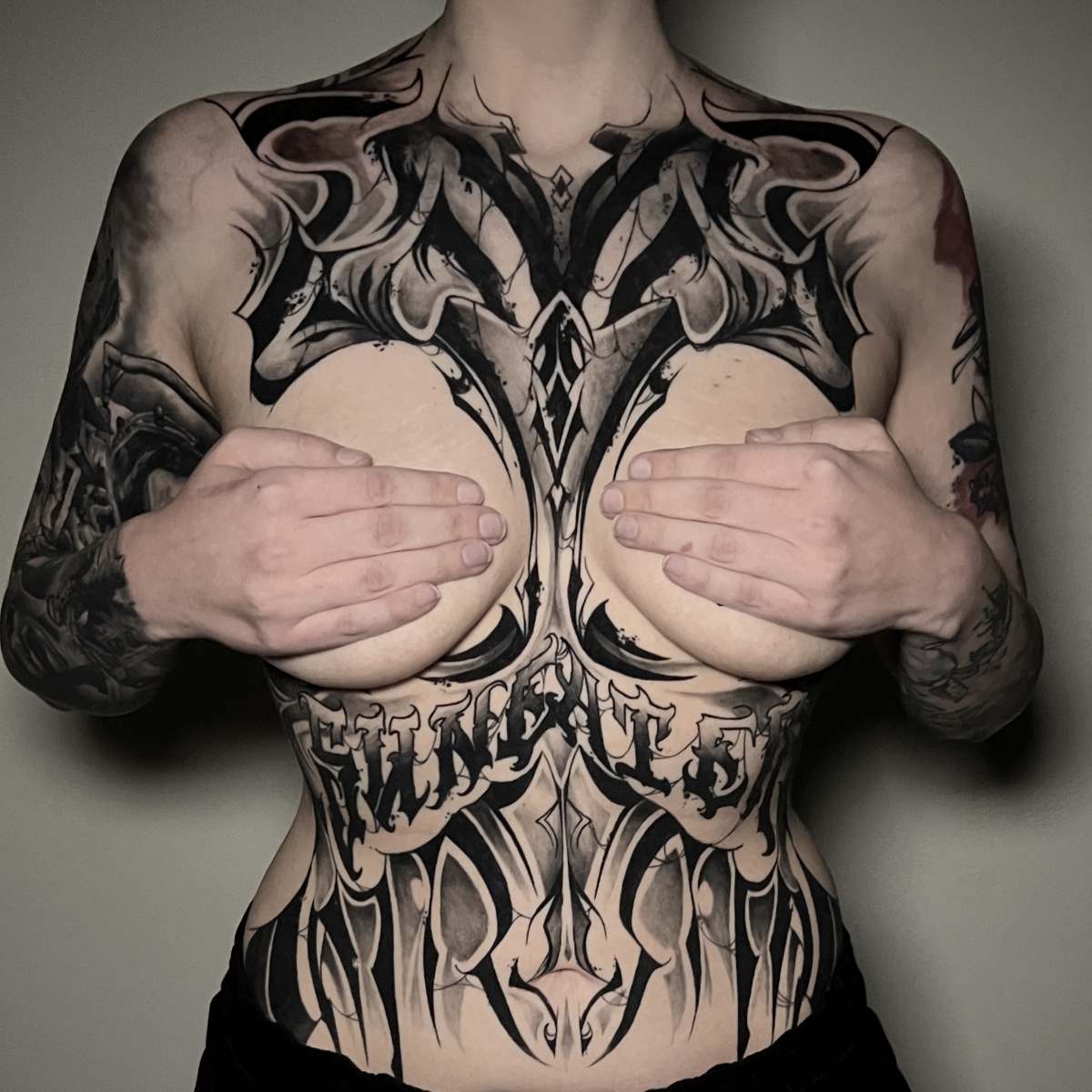 Black & grey Frontal piece Tattoo informatie Artiest Ella Hommen Stijl Blackwork Vorige Volgende agency@arino.com