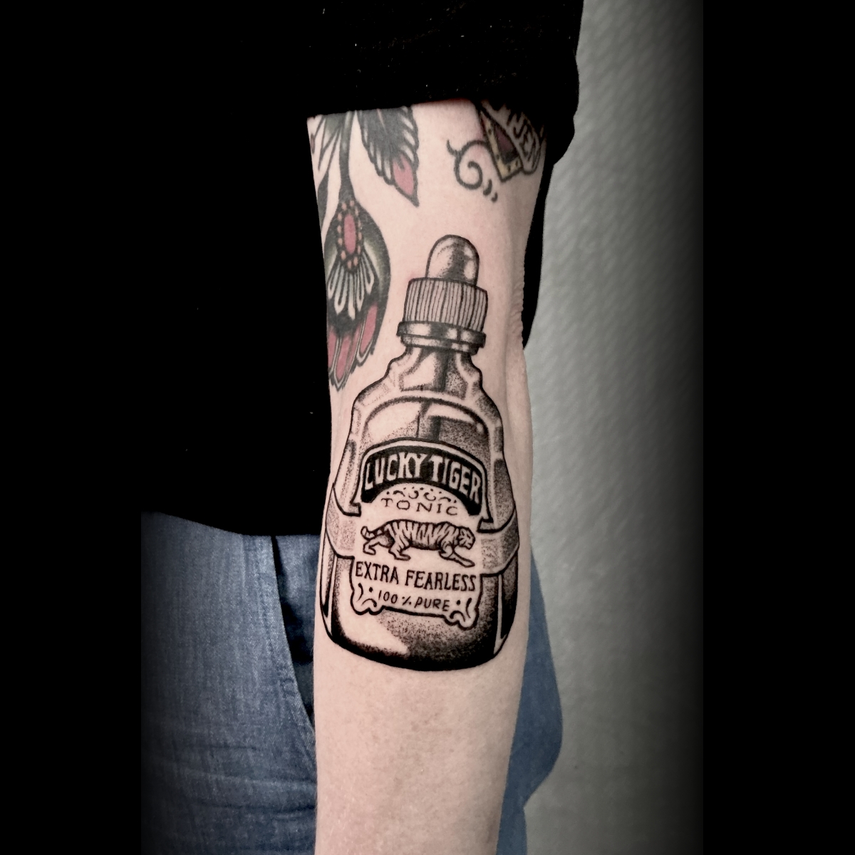 Black & grey Lucky Tiger Tonic Tattoo informatie Artiest Hanna Rosa Stijl Blackwork Vorige Volgende