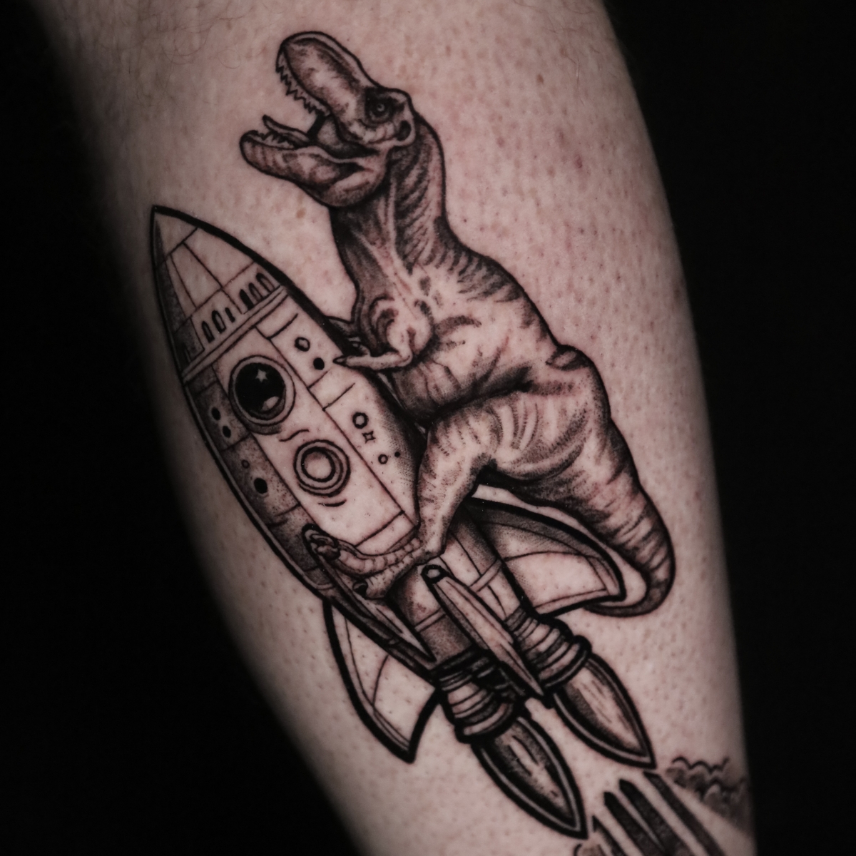 Black & grey Space T-Rex Tattoo informatie Artiest René de Bruijn Stijl Blackwork Vorige Volgende