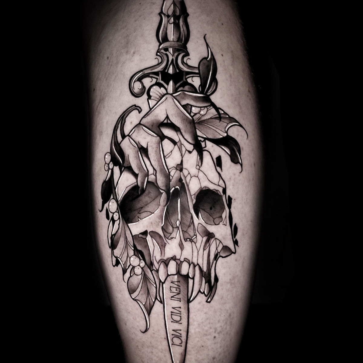 Vorige Volgende Black & grey Neo-traditional skull Tattoo informatie Artiest Orm Grutters Stijl Blackwork